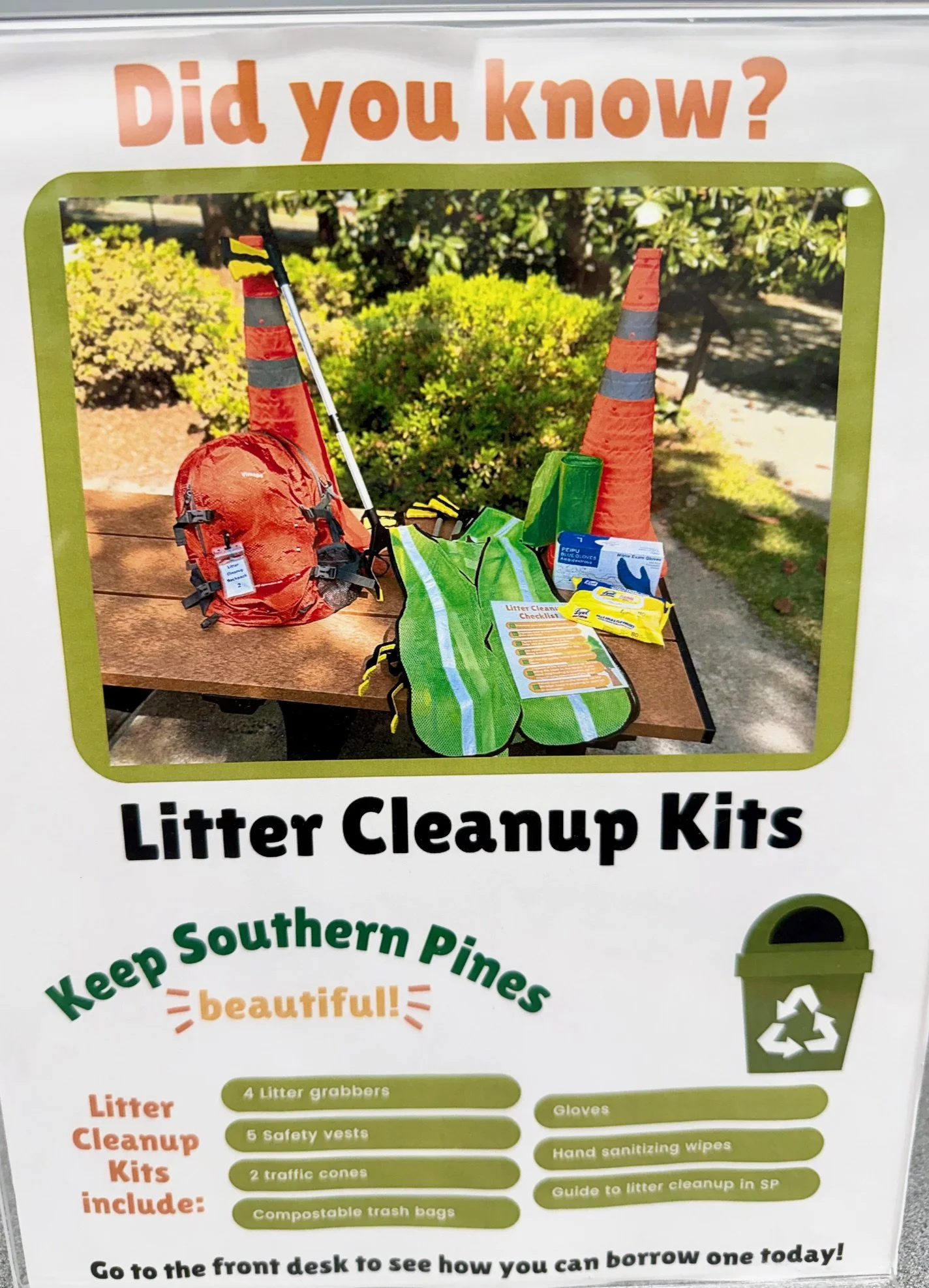 Libraries offer more than just books to check out! Check out the Southern Pines library where you can rent cleanup packs: borrow supplies to pick up trash around town and combine literacy with environmental stewardship.